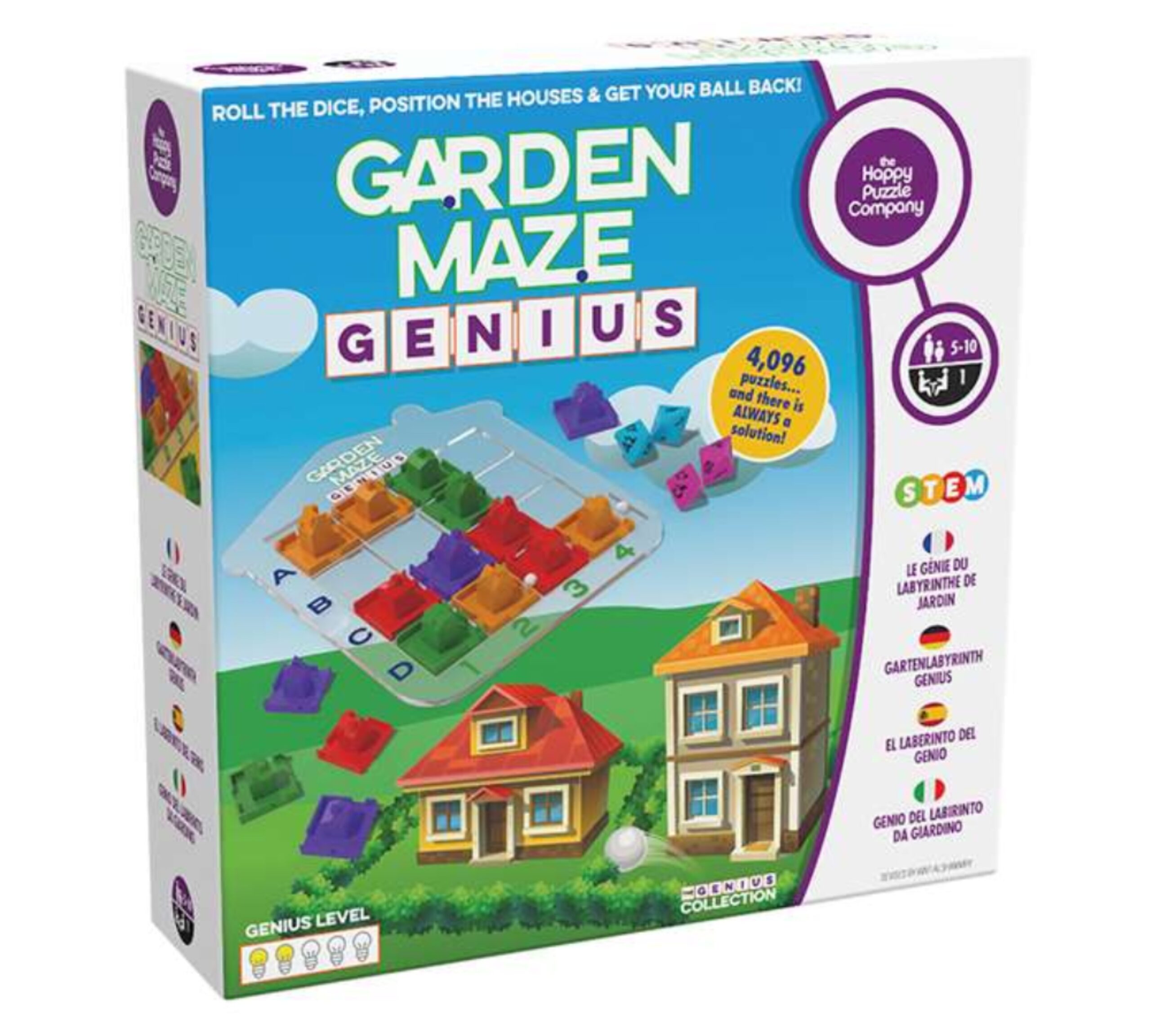 Your ball has ended up behind lots of houses. So, how will you get it back? Roll the four dice and you’ll discover the location of two of the houses, but think carefully about the direction they should face! Now start positioning the other houses until you create a route for the ball, then lift up the board using the grips at the side and roll it back!Garden Maze Genius is an all new ‘Genius’ game that will help children to develop their thinking skills, strategic planning and spatial awareness. There are 4,096 possible puzzles to attempt and each one successfully solved will lead to a boost in self-confidence and a growing belief that they too can be a Garden Maze Genius! Box size approx.. 27cm x 27cm